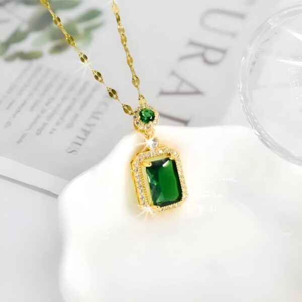 The square shape of the pendant and the green zircon stones give this necklace a unique and elegant look.