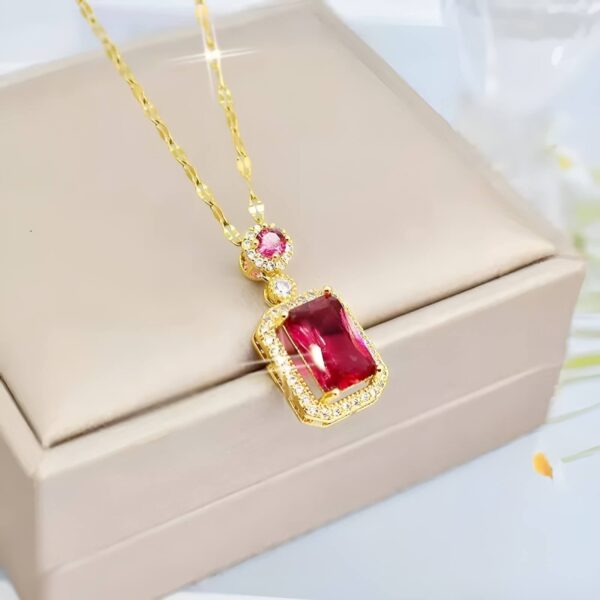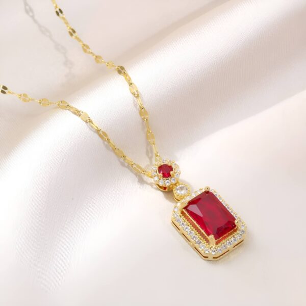 The square shape of the pendant and the red zircon stones give this necklace a unique and elegant look.